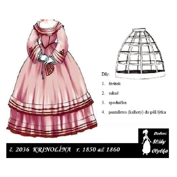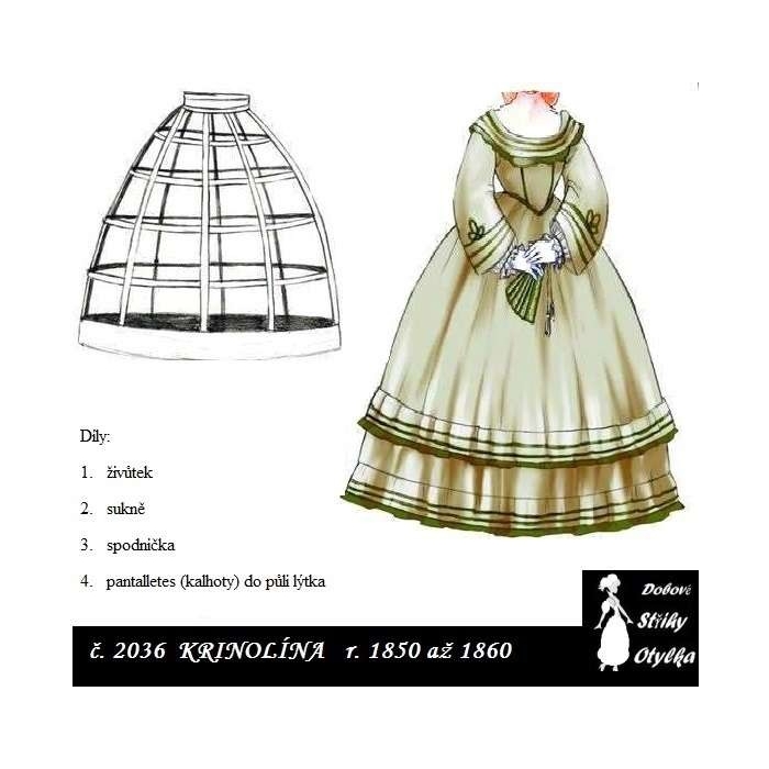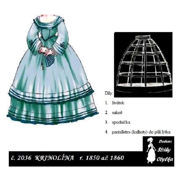 Zpočátku skládaná či nabíraná sukně po celé šíři stejně je později sešívaná z dílů a tvarově se tvarování posouvá do zadní části. Podle toho se změnila i krinolína, která ke konci nebyla ze všech stran stejná, ale v zadní části protáhlejší.