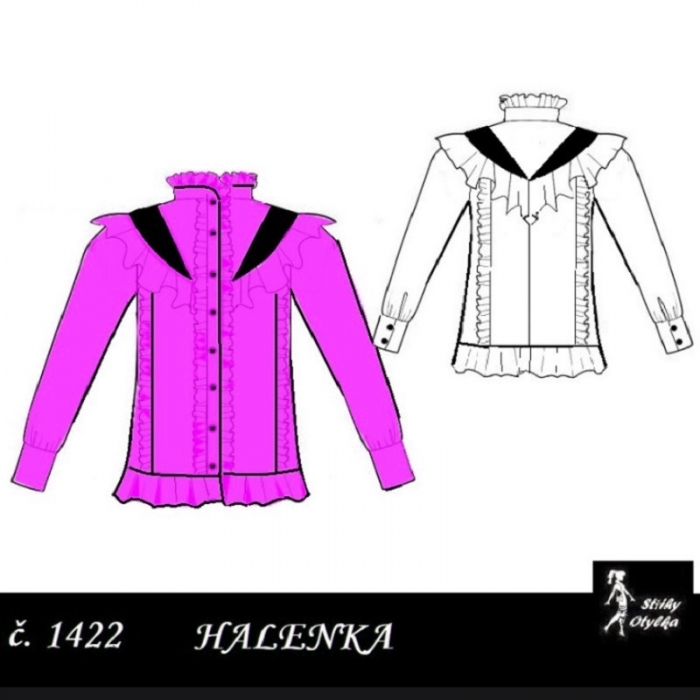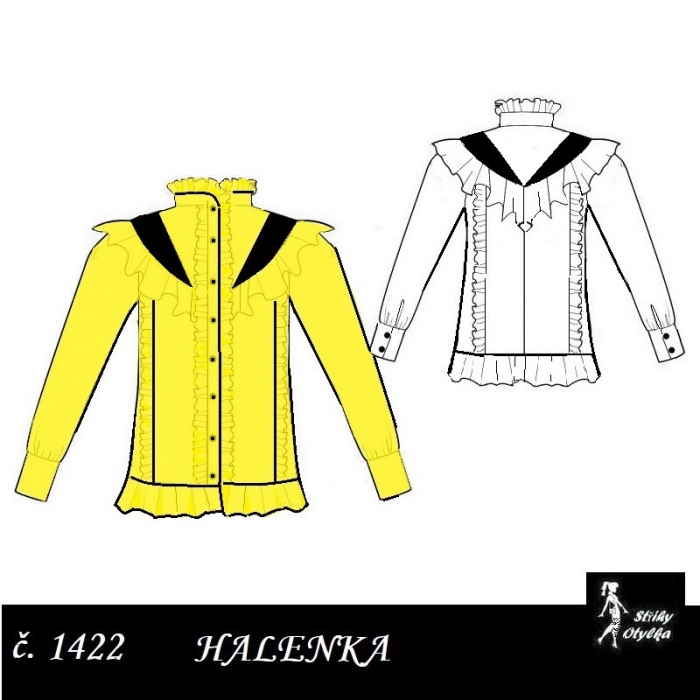 zajímavá moderní halenka se zapínáním na krytý zip, v pase zvýrazněná zapínáním na pásek vychází z tradice klasických prvorepublikových modelů
