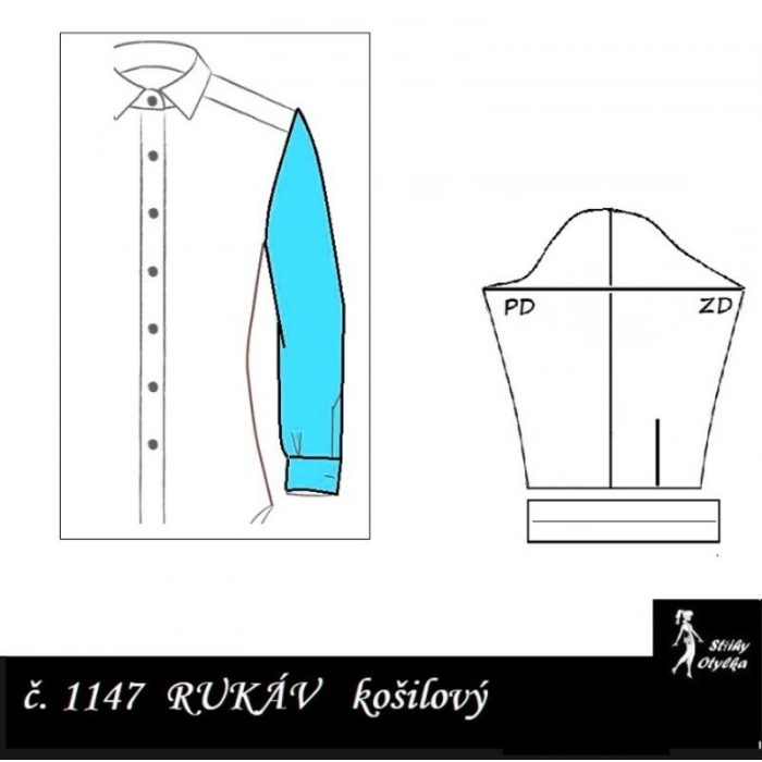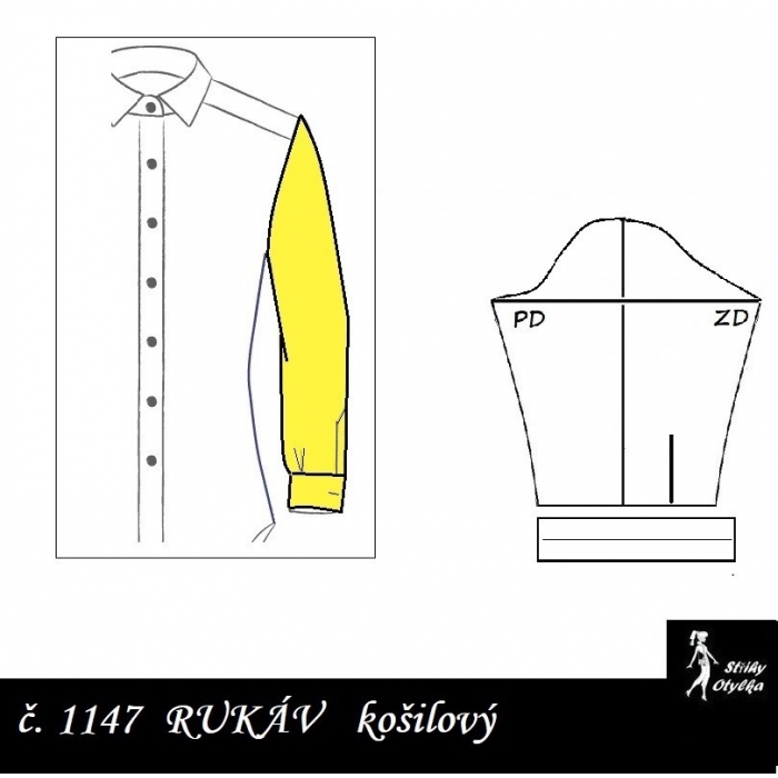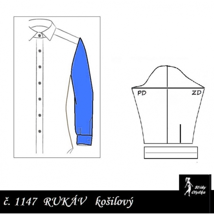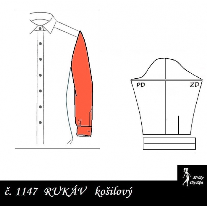střih na dlouhý rukáv dvoušvový, s přeneseným švem na PD rukávu