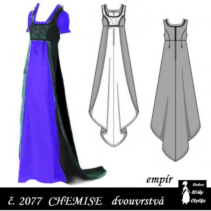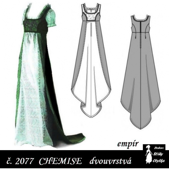 Pod chemise se nosil lehký trupový korzet a spodní dlouhá košile stejného střihu (s větším výstřihem a o 5 cm kratší). Spodní košile bývala z lehkého plátna, kupříkladu batistu a zaručovala menší průhlednost a splývavost svrchího chemise. Sukně chemise je nabíraná po celé šířce, v zadních partiiích, vyznačených na střihu, je silně řasená, nebo vrapovaná. Jako doplněk byly nošeny kašmírové šály.